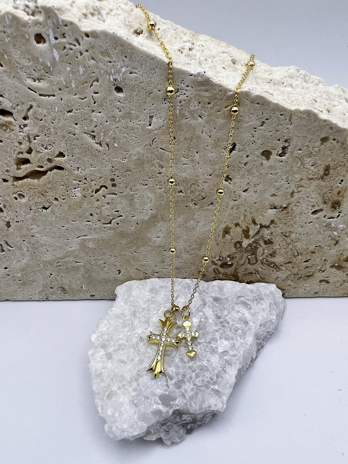 Experience a symphony of elegance and spirituality with the Eternal Elegance Double Cross Necklace. This exceptional piece encapsulates the eternal themes of love, faith, and elegance, making it a must-have addition to your jewellery collection or an exquisite gift for a cherished individual.